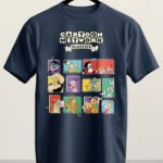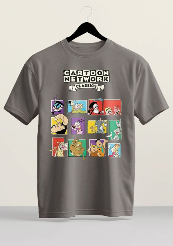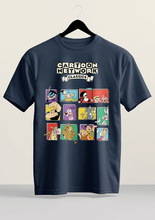 Nostalgic cartoon inspired graphic t-shirt featuring a colorful collage of classic animated characters. Perfect for pop culture lovers and streetwear fans.