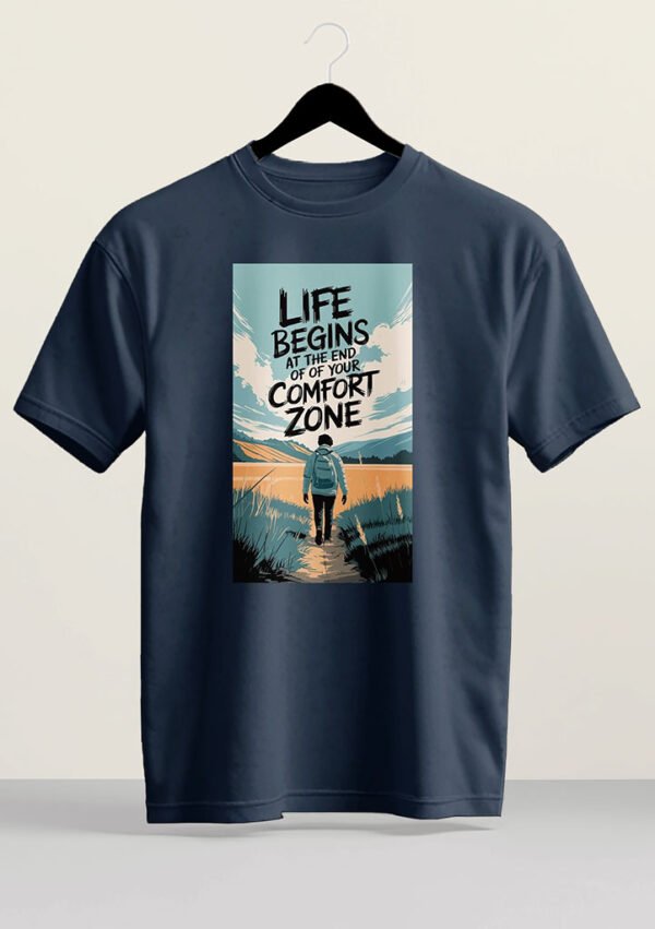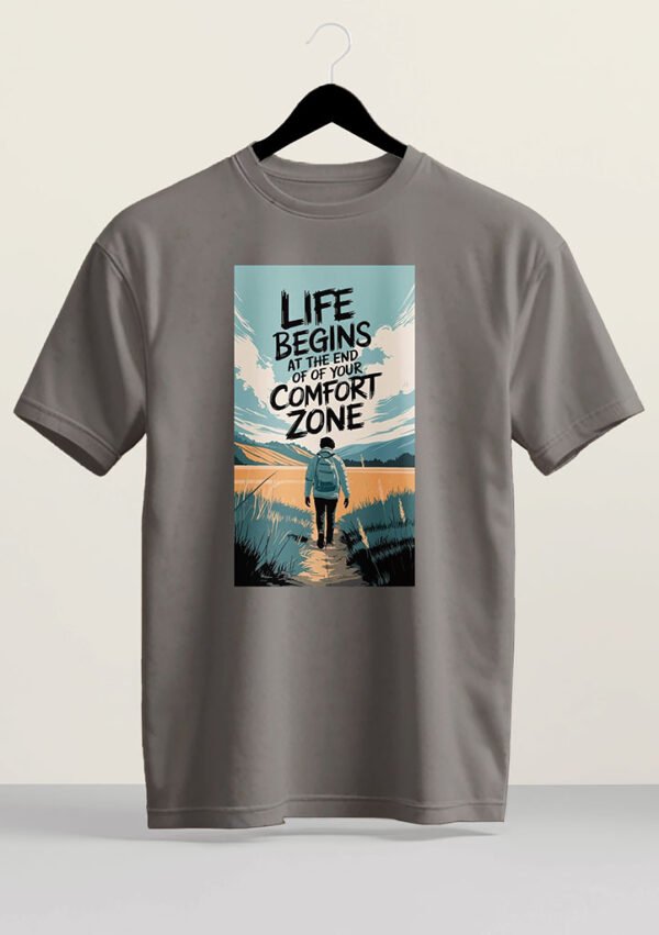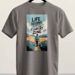 Motivational graphic t-shirt featuring the quote “Life Begins at the End of Your Comfort Zone.” A meaningful streetwear design for dreamers and explorers.