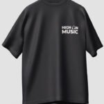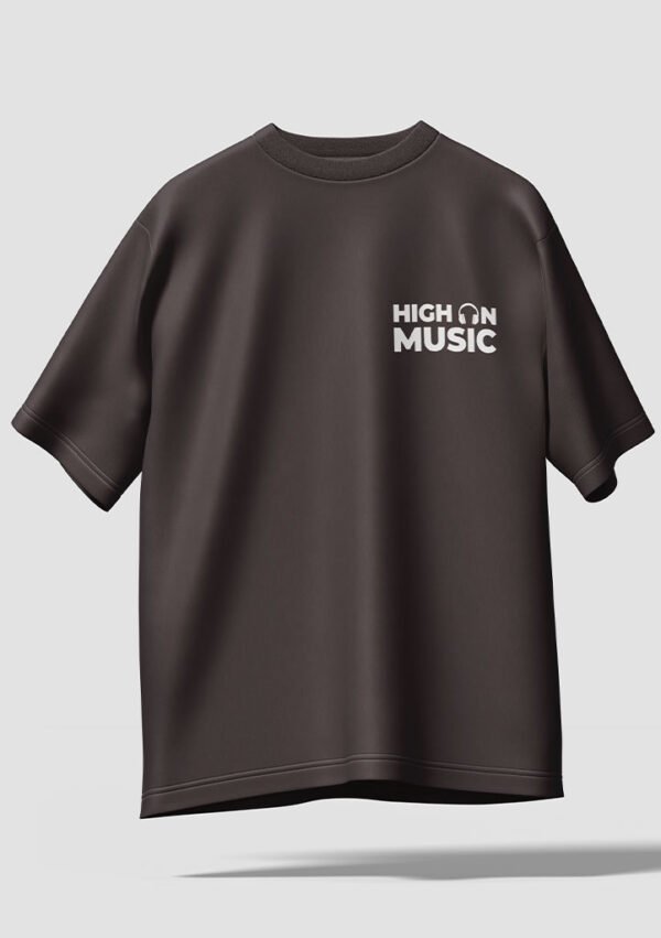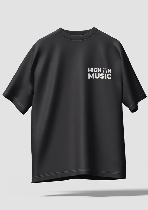 Cartoon music themed graphic t-shirt featuring a fun headphone character and “High On Music” typography. Perfect for music lovers and casual streetwear style.