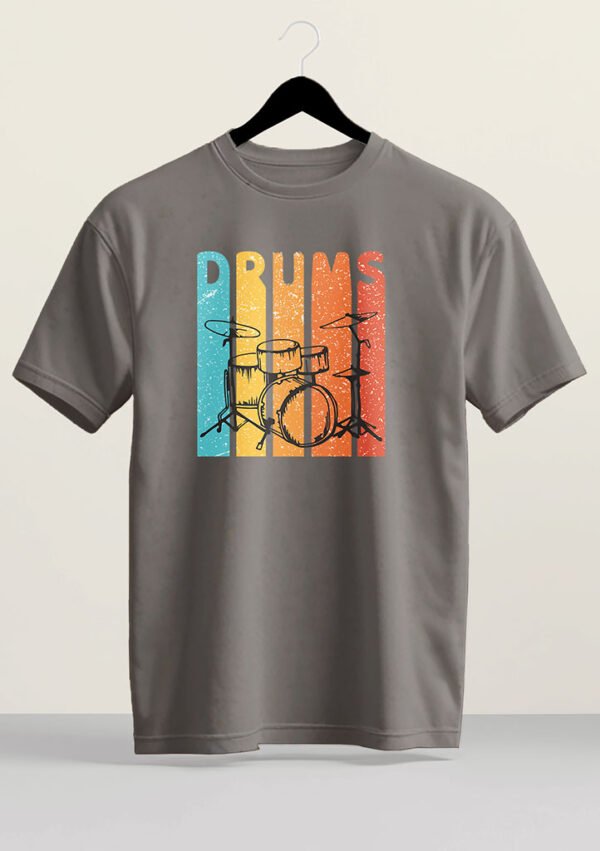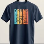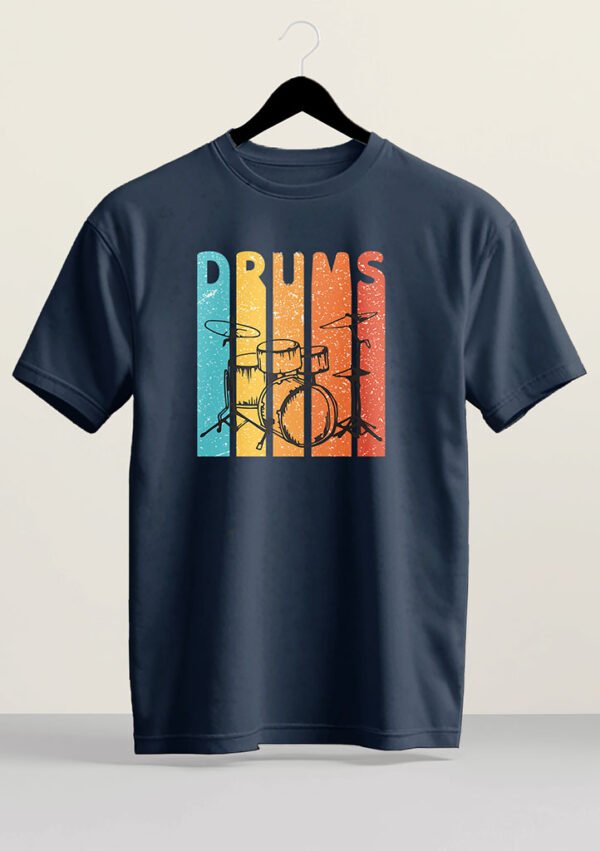 Retro music themed graphic t-shirt featuring a classic drum kit illustration and colorful vintage stripes. Perfect for musicians and music lovers.