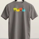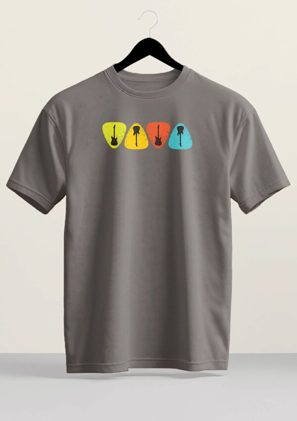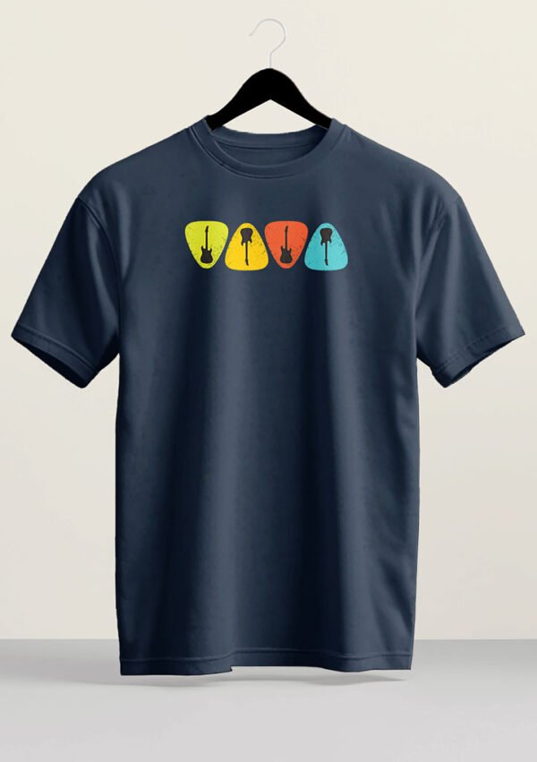 Music inspired graphic t-shirt featuring colorful guitar picks with guitar silhouettes. Perfect for guitar players, musicians, and music lovers.