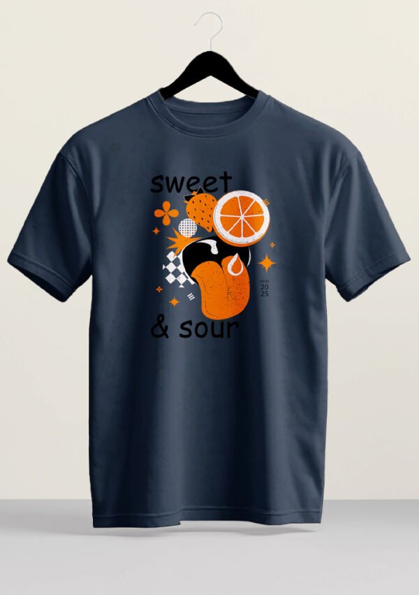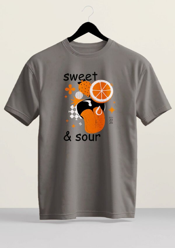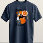 A zest of style for your everyday wardrobe. This retro-inspired design features bold orange and strawberry graphics with a playful “Sweet & Sour” motif.