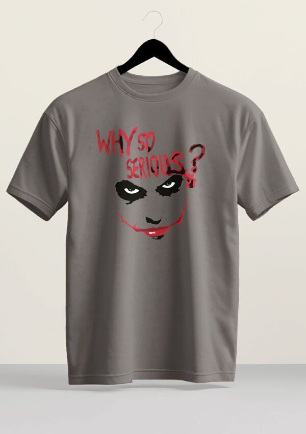 Dark villain inspired graphic t-shirt featuring the phrase “Why So Serious?” with a bold face illustration. Perfect for edgy streetwear and pop culture fans.